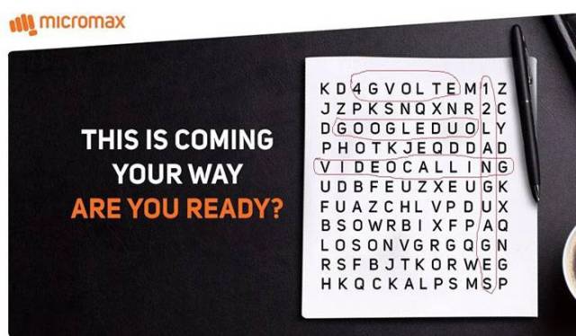 माइक्रोमैक्स इंडियन स्मार्टफ़ोन अपने आधिकारिक ट्वीटर हैंडल पर अगले स्मार्टफोन का एक वर्ड पज़ल के माध्यम से परीक्षण कर रहा है।इस पज़ल में अल्फाबेट्स शामिल है,जो माइक्रोमैक्स के आने वाले फ़ोन के फीचर्स की विशेषताएं बताता है।